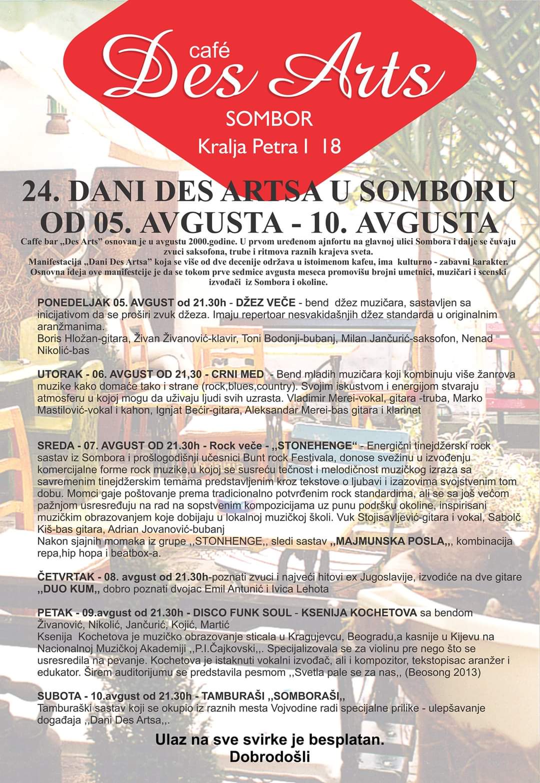 “U prvom uređenom ajnfortu na glavoj ulici Sombora i dalje se čuvaju zvuci saksofona, trube i ritmova raznih krajeva sveta. U okviru manifestacije Dani Des Artsa, koja se više od dve decenije održava u istoimenom kafeu, pripremili smo za vas sjajne svirke, od džeza, preko rocka i disco muzike, najvećih hitova, stranih i domaćih, pa do tamburaša. Dobro došli”, poručili su organizatori.