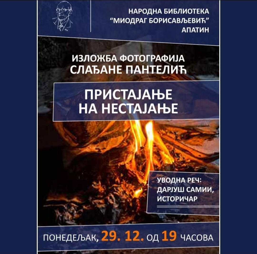 U ponedeljak, 29. decembra, sa početkom u 19 sati, u Narodnoj biblioteci “Miodrag Borisavljević” u Apatinu, biće otvorena izložba fotografija Slađane Pantelić, naziva „Pristajanje na nestajanje“. Uvodnu reč na ovoj izložbi imaće Darjuš Samii, istoričar, a događaj je besplatan za sve posetioce.