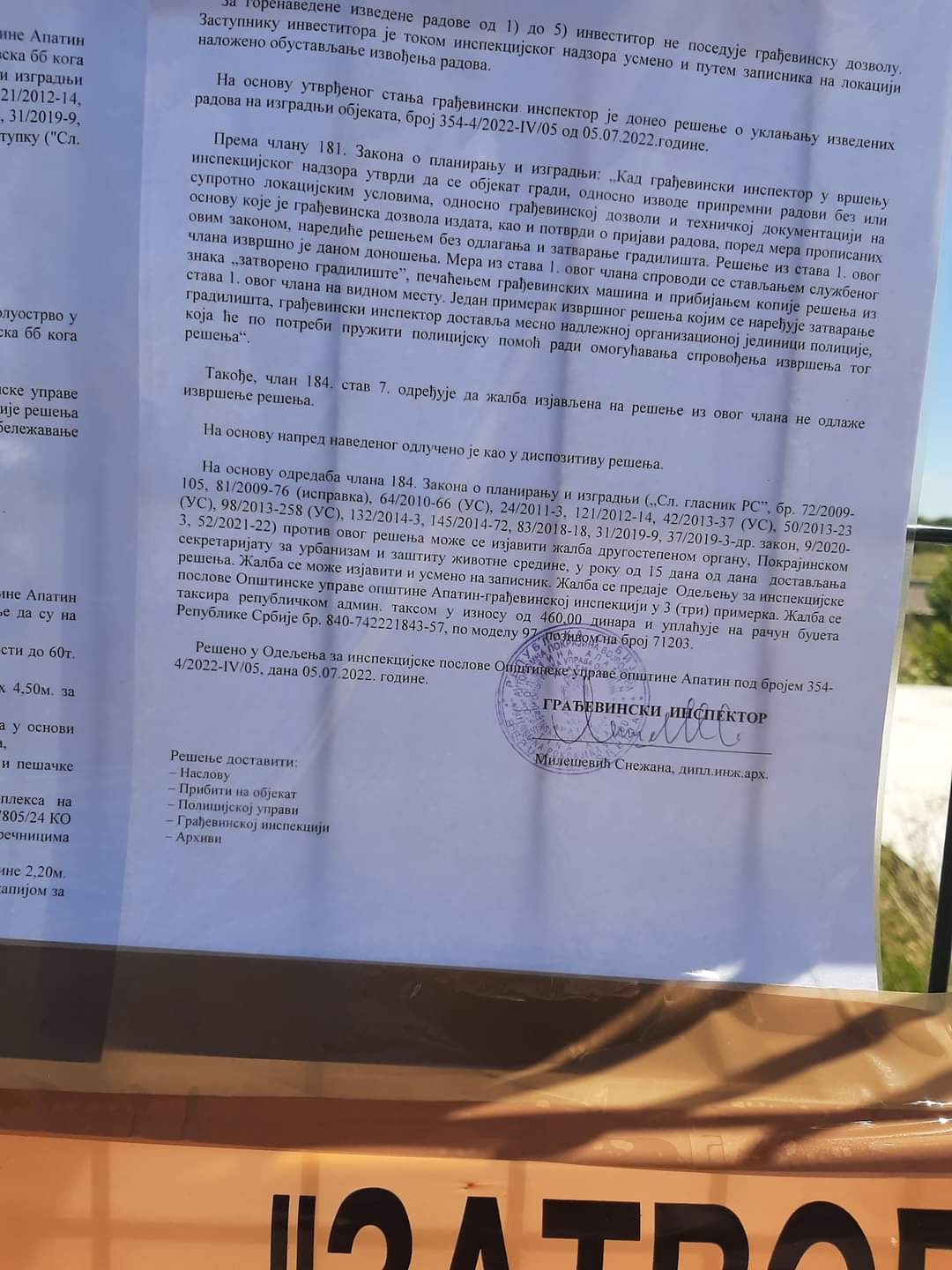 Rešenje građevinske inspekcije pozdravio je i Perica Popić, opozicioni odbornik u SO Apatin, koji se takođe bori protiv izgradnje reciklažnog centra evropskog otpada u Apatinu.