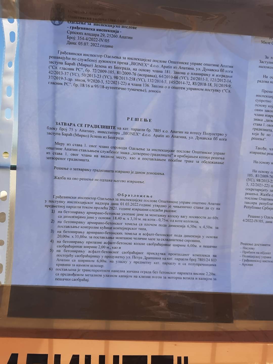 Po rešenju građevinske inspekcije, danas je zatvoreno gradilište „Bioneksa“! Po ovom rešenju zabranjena je svaka dalja gradnja i naloženo uklanjanje započetih radova. Važno je napomenuti i to da žalba na ovo rešenje ne odlaže njegovo izvršenje.