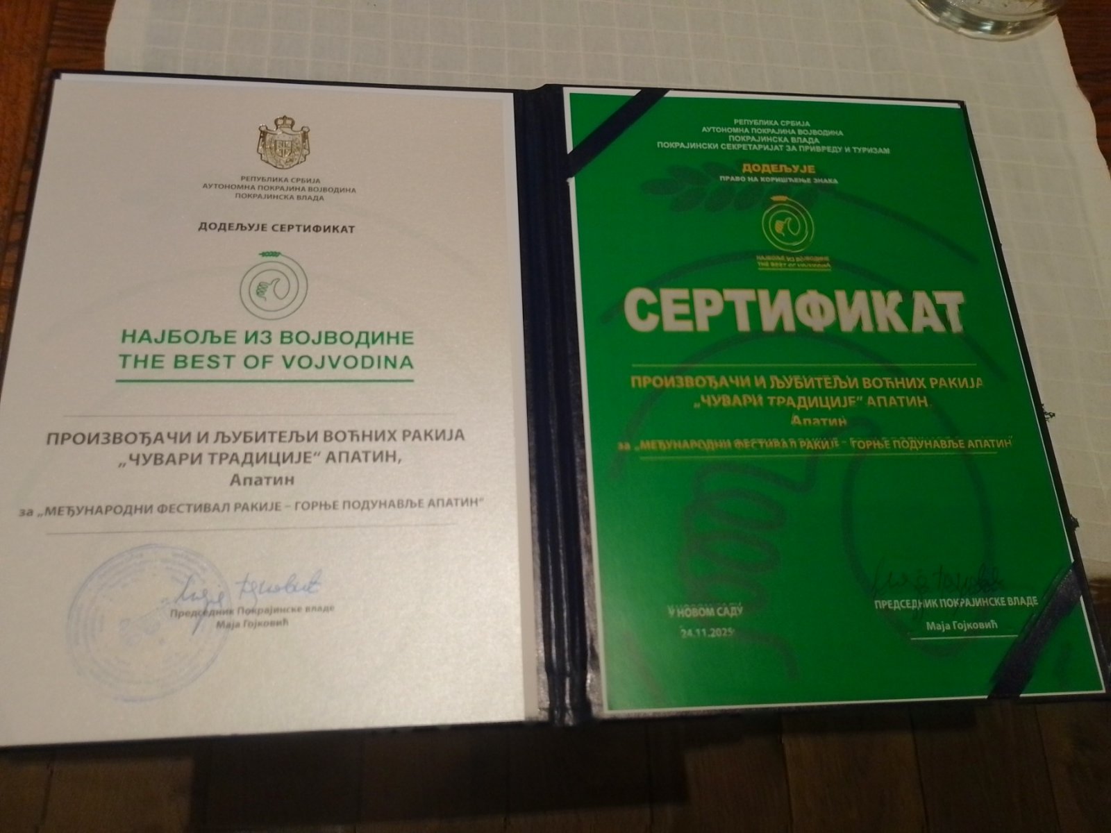 „Juče smo bili u Privrednoj komori Vojvodine na potpisivanju ugovora. Sa ponosom možemo reći da je naš rad i zalaganje na edukaciji i usavršavanju proizvodnje voćnih rakija prepoznala i komisija AP Vojvodine, te smo sa velikom radošću primili vest o sticanju sertifikata. Ovo je svakako motiv više da radimo još bolje i predanije, što će se, verujemo, videti već na narednom Međunarodnom festivalu rakije „Gornje Podunavlje“ u našem gradu“, izjavili su u apatinskom Udruženju proizvođača i ljubitelja voćnih rakija „Čuvari tradicije“.