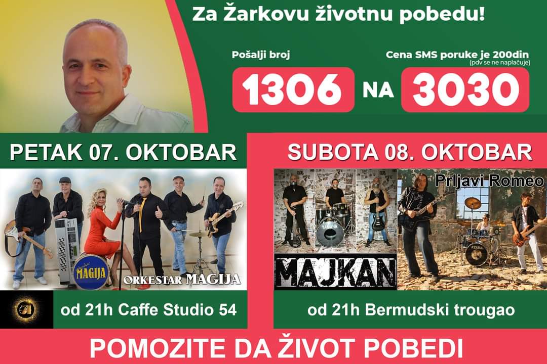 Za subotu, 8. oktobar, zakazana je još jedna humanitarna žurka za Žarka, i to u “Bermudskom trouglu”, gde će prisutni moći uživati u kocertima bendova “Majkan” i “Prljavi Romeo”.
